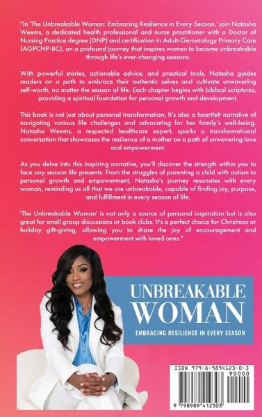 In 'The Unbreakable Woman: Embracing Resilience in Every Season,' join Natasha Weems, a dedicated health professional and nurse practitioner with a Doctor of Nursing Practice degree (DNP) and certification in Adult-Gerontology Primary Care (AGPCNP-BC), on a profound journey that inspires women to become unbreakable through life's ever-changing seasons. With powerful stories, actionable advice, and practical tools, Natasha guides readers on a path to embrace their authentic selves and cultivate unwavering self-worth, no matter the season of life. Each chapter begins with biblical scriptures, providing a spiritual foundation for personal growth and development. This book is not just about personal transformation; It's also a heartfelt narrative of navigating various life challenges and advocating for her family's well-being. Natasha Weems, a respected healthcare expert, sparks a transformational conversation that showcases the resilience of a mother on a path of unwavering love and empowerment. As you delve into this inspiring narrative, you'll discover the strength within you to face any season life presents. From the struggles of parenting a child with autism to personal growth and empowerment, Natasha's journey resonates with every woman, reminding us all that we are unbreakable, capable of finding joy, purpose, and fulfillment in every season of life. 'The Unbreakable Woman' is not only a source of personal inspiration but is also great for small group discussions or book clubs. It's a perfect choice for Christmas or holiday gift-giving, allowing you to share the joy of encouragement and empowerment with loved ones.
