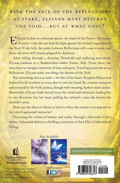 With the fate of the world at stake, Eliyana must destroy the Void . . . but at what cost? Eliyana Ember is a reluctant queen. As vessel of the Verity--the purest of souls--only she can lead the fight against the wicked magnetism of the Void. If she fails, the paths between Reflections will cease to exist, and those she loves will remain plagued by darkness. After falling through a draining Threshold and suffering near-death, Eliyana awakens to a Shadowalker-ridden Venice, Italy. From there, she must learn to navigate mysteries of time and space. Traveling across the seven Reflections, Eliyana seeks one thing: the demise of the Void. But something else is at stake--the fate of her heart. Kyaphus Rhyen and Joshua David, brothers in arms, duel to win her hand. Ky remains ensnared and tortured by the Void. Joshua, though well-meaning, harbors dark secrets. Meanwhile, Eliyana finds herself torn, her mind and memories leading her in one direction, but her heart pulling her toward a man she knows she shouldn't trust. How can she discern who to believe when she cannot even depend on her own fragmented memories? Traversing the realms of fantasy and reality through a labyrinth of plot twists, Unbreakabledelivers a thrilling conclusion to Sara Ella's Unblemished Trilogy. 1. The last in the low-spice, YA romantasy trilogy 2. Books best read in order: * Book 1: Unblemished * Book 2: Unraveling * Book 3: Unbreakable 3. Full-length book 4. Includes discussion questions for book clubs