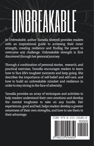 In Unbreakable, author Tamella Sherrell provides readers with an inspirational guide to accessing their inner strength, creating resilience and finding the power to overcome any challenge. Unbreakable strength is first discovered through her personal journey. Through a combination of personal stories, research, and practical exercises, Tamella encourages readers to learn how to face life's toughest moments and keep going. She describes the importance of self-belief and self-care, and how to build an unbreakable mindset and resilience in order to stay strong in the face of adversity. Tamella provides an array of techniques and activities to help readers understand their own emotions and develop the mental toughness to take on any hurdle. Her experiences, good and bad, helps readers develop a greater awareness of their own strengths, and how to use them to their advantage.