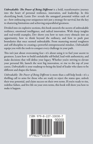 Unbreakable: The Power of Being Different is a bold, transformative journey into the heart of personal resilience, innovation, and leadership. In this electrifying book, Lenin Dev reveals the untapped potential within each of us-how embracing your uniqueness isn't just a strategy for survival, but the key to shattering limitations and achieving unparalleled greatness. Divided into six explosive sections, this book unravels the secrets of unbreakable resilience, emotional intelligence, and radical innovation. With sharp insights and real-world examples, Dev shows you how to turn every obstacle into an opportunity, how to think beyond the ordinary, and how to push past boundaries that once seemed unbreakable. From mastering mental toughness and self-discipline to creating a powerful entrepreneurial mindset, Unbreakable equips you with the tools to conquer every challenge in your path. This isn't just about overcoming fear-it's about using it to fuel your ascent to greatness. Learn how to build unshakable self-belief, lead with authenticity, and make decisions that will define your legacy. Whether you're striving to elevate your personal life, launch the next big innovation, or rise to the top of your career, Unbreakable is your roadmap to being the kind of leader who dares to be different and shapes the future. Unbreakable: The Power of Being Different is more than a self-help book-it's a thrilling call to arms for those who are ready to reject the status quo, unlock their true potential, and claim success on their own terms. If you're ready to rise, redefine failure, and live life on your own terms, this book will show you how to make it happen.