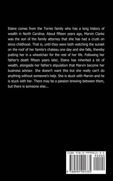 Elaine comes from the Torres family who has a long history of wealth in North Carolina. About fifteen years ago, Marvin Clarke was the son of the family attorney that she has had a crush on since childhood. That is, until they were both watching the sunset on the roof of her family's chateau one day and she falls, thereby putting her in a wheelchair for the rest of her life. Following her father's death fifteen years later, Elaine has inherited a lot of wealth, alongside her father's stipulation that Marvin become her business advisor. She doesn't want this but she really can't do anything without someone's help. She is stuck with Marvin and he is stuck with her. There may be a passion brewing between them, but there is someone else....
