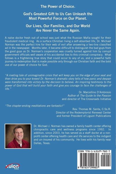 The Power of Choice. God's Greatest Gift to Us Can Unleash the Most Powerful Force on Our Planet. Our Lives, Our Families, and Our World Are Never the Same Again. A naïve doctor fresh out of school was just what the Russian Mafia sought for their fraudulent medical ring. As a surface Christian living a self-absorbed life, Dr. Michael Norman was the perfect hire for their web of evil after answering a two-line classified ad in the newspaper. Months later, it became difficult to distinguish the bad guys from the good guys as Dr. Norman's cooperation was cruelly turned against him by corrupt government officials well aware of his accidental ties to this criminal conspiracy. What follows is a frightening true story that could occur to any of us, and a powerful faith journey to redemption that is made possible only through our Christian faith and the bold use of our power of choice for God. "A riveting tale of unimaginable crisis that will keep you on the edge of your seat and then drive you to your knees! Dr. Norman's dramatic story tells of how panic and despair were transformed into victory by the decision to believe. An inspiring testimony to the power of God that will build your faith and give you courage to face the challenges of life."- Dr. Marcellino D'Ambrosio Author of The Guide to the Passion and director of The Crossroads Initiative "The chapter-ending meditations are fantastic!"- Rev. Thomas M. Santa, C.Ss.R. Director of the Redemptorist Renewal Center and former President of Liguori Publications Dr. Michael J. Norman has owned a family health center offering chiropractic care and wellness programs since 1992. In addition, since 2003, he has served as a staff doctor at a nonprofit center offering health care and life services to the indigent and un-insured of his community. He lives with his family near Dallas, Texas.