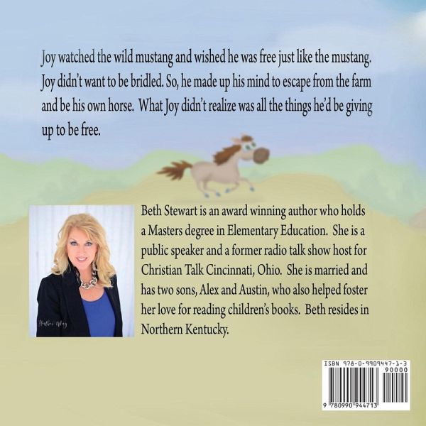 Joy watched the wild mustang and wished he were free just like the mustang. Joy didn't want to be bridled, so, he made up his mind to escape from the farm and be his own horse. What Joy didn't realize was all the things he'd be giving up to be free. Joy learns a valuable lesson about true freedom, and it wasn't what he thought. Freecom comes with a price, and true Joy comes in the appreciation of your family and friends.