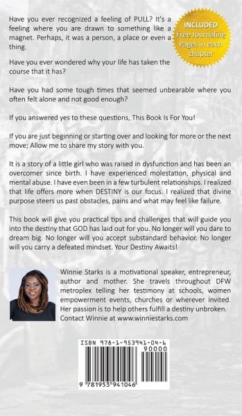 From the Back Cover ¿Have you ever recognized a feeling of PULL? It's a feeling where you are drawn to something like a magnet. Perhaps, it was a person, a place or even a thing. ¿Have you ever wondered why your life has taken the course that it has? ¿Have you had some tough times that seemed unbearable where you often felt alone and not good enough? ¿¿¿¿¿If you answered yes to these questions, This Book Is For You!!¿¿¿¿¿ If you are just beginning or starting over and looking for more or the next move; Allow me to share my story with you.¿ It is a story of a little girl who was raised in dysfunction and has been an overcomer since birth. I have experienced molestation, physical and mental abuse. I have even been in a few turbulent relationships. I realized that life offers more when DESTINY is our focus. I realized that divine purpose steers us past obstacles, pains and what may feel like failure. BONUS: ¿INCLUDES 10 FREE PERSONAL DEVELOPMENT AND HEALING CHALLENGES ¿INCLUDES FREE JOURNALING PAGES IN EACH CHAPTER ¿¿¿This book will give you practical tips and challenges that will guide you into the destiny that GOD has laid out for you. No longer will you dare to dream big. No longer will you accept substandard behavior. No longer will you carry a defeated mindset. Your Destiny Awaits!!!¿¿¿