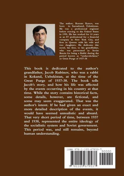 This book is dedicated to the author's grandfather, Jacob Rubinov, who was a rabbi in Kokand, Uzbekistan, at the time of the Great Purge of 1937-38. The book tells Jacob's story, and how his life was affected by the events occurring in his country at that time. While the story contains historical facts, some details, however, are fictional, and some may seem exaggerated. That was the author's intent. If he had given an exact and more detailed description of the events, it would have seemed unrealistic and absurd. That very short period of time, between 1937 and 1938, represented the entire ideology of the socialistic system and Soviet government. This period was, and still remains, beyond human understanding.