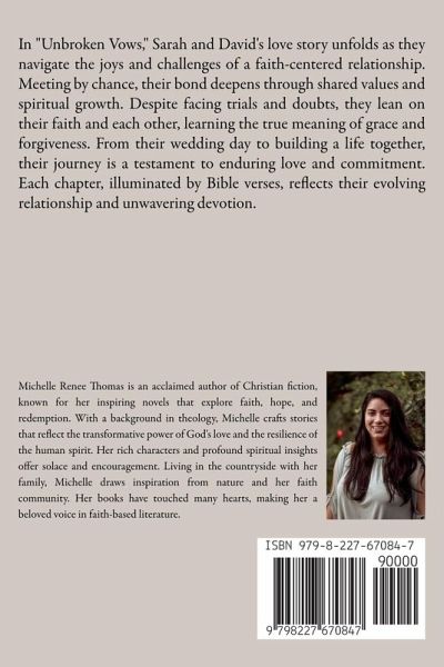 In "Unbroken Vows," Sarah and David's love story unfolds as they navigate the joys and challenges of a faith-centered relationship. Meeting by chance, their bond deepens through shared values and spiritual growth. Despite facing trials and doubts, they lean on their faith and each other, learning the true meaning of grace and forgiveness. From their wedding day to building a life together, their journey is a testament to enduring love and commitment. Each chapter, illuminated by Bible verses, reflects their evolving relationship and unwavering devotion.