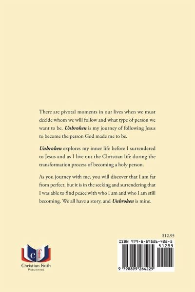 There are pivotal moments in our lives when we must decide whom we will follow and what type of person we want to be. UnBroken is my journey of following Jesus to become the person God made me to be. UnBroken explores my inner life before I surrendered to Jesus and as I live out the Christian life during the transformation process of becoming a holy person. As you journey with me, you will discover that I am far from perfect, but it is in the seeking and surrendering that I was able to find peace with who I am and who I am still becoming. We all have a story, and UnBroken is mine.