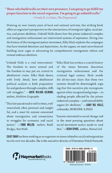 "In the wake of post-9/11 xenophobia, Obama's record-level deportations, Trump's immigration policies, and the 2020 uprisings for racial justice, the US remains entrenched in a circular discourse regarding migrant justice. As organizer Silky Shah argues in Unbuild Walls, we must move beyond building nicer cages or advocating for comprehensive immigration reform. Our only hope for creating a liberated society for all, she insists, is abolition. Unbuild Walls dives into US immigration policy and its relationship to mass incarceration, from the last forty years up to the present, showing how the prison-industrial complex and immigration enforcement are intertwined systems of repression. Incorporating historical and legal analyses, Shah's personal experience as an organizer, as well as stories of people, campaigns, organizations, and localities that have resisted detention and deportation, Shah assesses the movement's strategies, challenges, successes, and shortcomings. Featuring a foreword by Amna A. Akbar, Unbuild Walls is an expansive and radical intervention, bridging the gaps between movements for immigrant rights, racial justice, and prison abolition." --