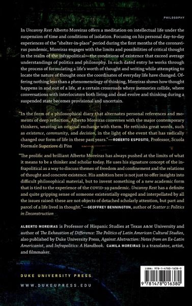 In Uncanny Rest Alberto Moreiras offers a meditation on intellectual life under the suspension of time and conditions of isolation. Focusing on his personal day-to-day experiences of the "shelter-in-place" period during the first months of the coronavirus pandemic, Moreiras engages with the limits and possibilities of critical thought in the realm of the infrapolitical-the conditions of existence that exceed average understandings of politics and philosophy. In each dated entry he works through the process of formulating a life's worth of thought and writing while attempting to locate the nature of thought once the coordinates of everyday life have changed. Offering nothing less than a phenomenology of thinking, Moreiras shows how thought happens in and out of a life, at a certain crossroads where memories collide, where conversations with interlocutors both living and dead evolve and thinking during a suspended state becomes provisional and uncertain.
