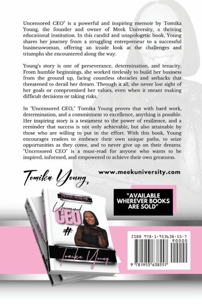 "Uncensored CEO" is a powerful and inspiring memoir by Tomika Young, the founder and owner of Meek University, a thriving educational institution. In this candid and unapologetic book, Young shares her journey from a struggling entrepreneur to a successful businesswoman, offering an inside look at the challenges and triumphs she encountered along the way. Young's story is one of perseverance, determination, and tenacity. From humble beginnings, she worked tirelessly to build her business from the ground up, facing countless obstacles and setbacks that threatened to derail her dream. Through it all, she never lost sight of her goals or compromised her values, even when it meant making difficult decisions or taking risks. "Uncensored CEO" offers a unique perspective on what it takes to succeed in the cutthroat world of business, and how to stay true to oneself while climbing the ladder of success. With raw honesty and a bold, no-nonsense approach, Young shares her insights and strategies for overcoming adversity, building a strong team, and creating a culture of excellence. Whether you're an aspiring entrepreneur or a seasoned CEO, "Uncensored CEO " is a must-read for anyone who wants to learn what it takes to achieve success on their own terms. With powerful lessons and a riveting story, this book is sure to inspire and motivate readers to reach for their own dreams, no matter how daunting they may seem. In "Uncensored CEO," Tomika Young proves that with hard work, determination, and a commitment to excellence, anything is possible. Her inspiring story is a testament to the power of resilience, and a reminder that success is not only achievable, but also attainable by those who are willing to put in the effort. With this book, Young encourages readers to embrace their own unique paths, to seize opportunities as they come, and to never give up on their dreams. "Uncensored CEO" is a must-read for anyone who wants to be inspired, informed, and empowered to achieve their own greatness.