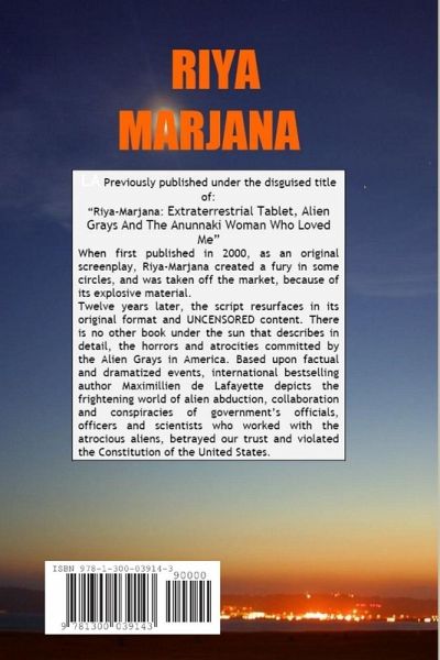 Published by UFOs & Supernatural Magazine. When first published in 2000, as an original screenplay, the story created a fury in military and governments' circles, and was taken off the market, because of its explosive material. Twelve years later, the script resurfaces in its original format and UNCENSORED content. There is no other book under the sun that describes in detail, the horrors and atrocities committed by the Alien Grays in America. Based upon factual and dramatized events, international bestselling author Maximillien de Lafayette depicts the frightening world of alien abduction, collaboration and conspiracies of government's officials, officers and scientists who worked with the atrocious aliens, betrayed our trust and violated the Constitution of the United States.