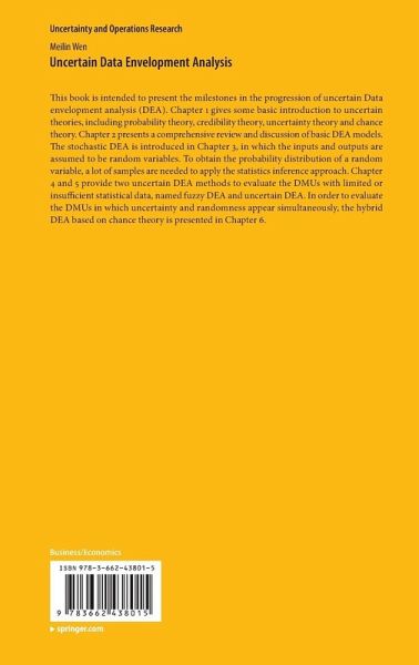 This book is intended to present the milestones in the progression of uncertain Data envelopment analysis (DEA). Chapter 1 gives some basic introduction to uncertain theories, including probability theory, credibility theory, uncertainty theory and chance theory. Chapter 2 presents a comprehensive review and discussion of basic DEA models. The stochastic DEA is introduced in Chapter 3, in which the inputs and outputs are assumed to be random variables. To obtain the probability distribution of a random variable, a lot of samples are needed to apply the statistics inference approach. Chapter 4 and 5 provide two uncertain DEA methods to evaluate the DMUs with limited or insufficient statistical data, named fuzzy DEA and uncertain DEA. In order to evaluate the DMUs in which uncertainty and randomness appear simultaneously, the hybrid DEA based on chance theory is presented in Chapter 6.
