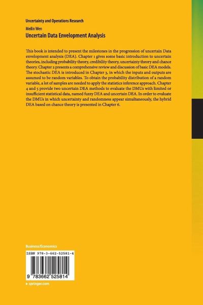 This book is intended to present the milestones in the progression of uncertain Data envelopment analysis (DEA). Chapter 1 gives some basic introduction to uncertain theories, including probability theory, credibility theory, uncertainty theory and chance theory. Chapter 2 presents a comprehensive review and discussion of basic DEA models. The stochastic DEA is introduced in Chapter 3, in which the inputs and outputs are assumed to be random variables. To obtain the probability distribution of a random variable, a lot of samples are needed to apply the statistics inference approach. Chapter 4 and 5 provide two uncertain DEA methods to evaluate the DMUs with limited or insufficient statistical data, named fuzzy DEA and uncertain DEA. In order to evaluate the DMUs in which uncertainty and randomness appear simultaneously, the hybrid DEA based on chance theory is presented in Chapter 6.