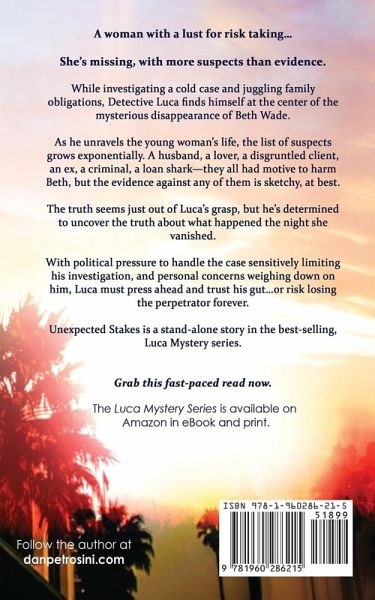 A woman with a lust for risk taking... She's missing, with more suspects than evidence. While investigating a cold case and juggling family obligations, Detective Luca finds himself at the center of the mysterious disappearance of Beth Wade. As he unravels the young woman's life, the list of suspects grows exponentially. A husband, a lover, a disgruntled client, an ex, a criminal, a loan shark-they all had motive to harm Beth, but the evidence against any of them is sketchy, at best. The truth seems just out of Luca's grasp, but he's determined to uncover the truth about what happened the night she vanished. With political pressure to handle the case sensitively limiting his investigation, and personal concerns weighing down on him, Luca must press ahead and trust his gut...or risk losing the perpetrator forever. Unexpected Stakes is a stand-alone story in the best-selling, Luca Mystery series.