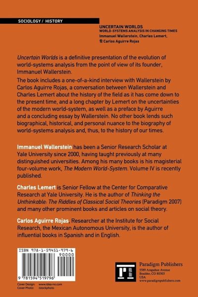 Uncertain Worlds is the definitive presentation of the evolution of world-systems analysis from the point of view of its founder, Immanuel Wallerstein. Few theorists have offered a more systematic theory of what has become known as 'globalisation' than Wallerstein. The book includes a one-of-kind interview with Wallerstein by Carlos Rojas, a conversation between Wallerstein and Lemert about the history of the field as it has come down to the present time, a long essay by Lemert on the uncertainties of the modern world-system, as well as a preface by Rojas and a concluding essay by Wallerstein. No other book lends such biographical, historical, and personal nuance to the biography of world-systems analysis and, thus, to the history of our times. The will be a key reference book for students of global politics, economics and international relations.
