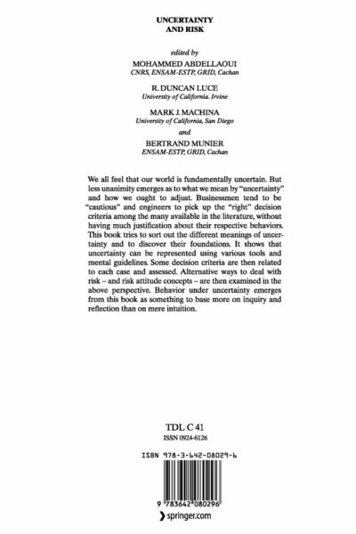 Foundations.- Conjectures, Refutations and Discoveries: Incorporating New Knowledge in Models of Belief and Choice under Uncertainty.- When an Event Makes a Difference.- Countable Additivity and the Foundations of Bayesian Statistics.- On the Quantification and Decomposition of Uncertainty.- The Importance of Representational Tools in Understanding Behaviour Under Uncertainty and Risk.- Preference for Diversification with Similarity Considerations.- Uncertainty Improves the Second-Best.- Lorenz Meets Rating but Misses Valuation.- A Deeper Look at Hyperbolic Discounting.- The Assessment of Several Alternative Decision Rules.- "Take-the-Best" and Other Simple Strategies: Why and When They Work "Well" with Binary Cues.- On Generalized Secretary Problems.- Voting on Alternatives or on Criteria? The Meta-Decision on Group Decision Procedures.- Models of Risk Attitude Modelling and Methodological Issues.- Probabilistic Risk Analysis Versus Decision Analysis: Similarities, Differences and Illustrations.- A Conjoint Measurement Based Rationale for Inducing Preferences.- Active Search for Probability Information and Recall Performance: Is Probability an Outstanding Element in the Mental Representation of Risky Decisions?.- Evolutionary Analysis of Risk Attitudes in Competitive Bidding Environments Using Simulation.- Behavior in Risky Decisions: Focus on Risk Defusing.