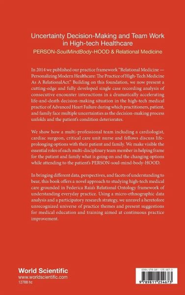 The Relational Medicine project is growing. In 2014 we published our practice framework "Relational Medicine - Personalizing Modern Healthcare: The Practice of High-Tech Medicine As A RelationalAct". Building on this foundation, we now present a cutting-edge and fully developed single case recording analysis of consecutive encounter interactions in a dramatically accelerating life-and-death decision-making situation in the high-tech medical practice of Advanced Heart Failure during which practitioners, patient, and family face multiple uncertainties as the decision-making process unfolds and the patient's condition deteriorates. We show how a multi-professional team including a cardiologist, cardiac surgeon, critical care unit nurse and fellows discuss life-prolonging options with their patient and family. We make visible the essential roles of each multi-disciplinary team member in helping frame for the patient and family what is going on and the changing options while attending to the patient's PERSON-soul-mind-body-HOOD. In bringing different data, perspectives, and facets of understanding to bear, this book offers a novel approach to studying high-tech medical care grounded in Federica Raia's Relational Ontology framework of understanding everyday practice. Using a micro-ethnographic data analysis and a participatory research strategy, we unravel a heretofore unrecognized universe of practice themes and present suggestions for medical education and training aimed at continuous practice improvement.