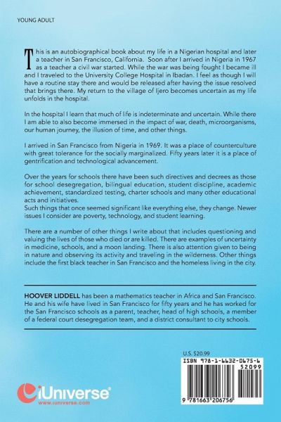 This is an autobiographical book about my life in a Nigerian hospital and later a teacher in San Francisco, California. Soon after I arrived in Nigeria in 1967 as a teacher a civil war started. While the war was being fought I became ill and I traveled to the University College Hospital in Ibadan. I feel as though I will have a routine stay there and would be released after having the issue resolved that brings there. My return to the village of Ijero becomes uncertain as my life unfolds in the hospital. In the hospital I learn that much of life is indeterminate and uncertain. While there I am able to also become immersed in the impact of war, death, microorganisms, our human journey, the illusion of time, and other things. I arrived in San Francisco from Nigeria in 1969. It was a place of counterculture with great tolerance for the socially marginalized. Fifty years later it is a place of gentrification and technological advancement. Over the years for schools there have been such directives and decrees as those for school desegregation, bilingual education, student discipline, academic achievement, standardized testing, charter schools and many other educational acts and initiatives. Such things that once seemed significant like everything else, they change. Newer issues I consider are poverty, technology, and student learning. There are a number of other things I write about that includes questioning and valuing the lives of those who died or are killed. There are examples of uncertainty in medicine, schools, and a moon landing. There is also attention given to being in nature and observing its activity and traveling in the wilderness. Other things include the first black teacher in San Francisco and the homeless living in the city.