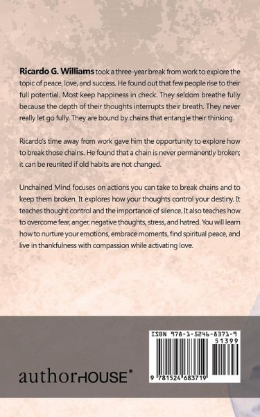 I took a three-year break from work to explore the topic of peace, love, and success. I spent the time analyzing my thoughts and the effects my thoughts had on my emotional state of mind. The things I found out were quite intriguing. I came to the realization that many of us are not living to our full potential. We live with a measured joy. We keep our happiness in check. Our smiles are met with a restriction from our breath, which makes it short-lived. We seldom breathe fully because our breath is interrupted by the depth of our thoughts. We never really let go fully. We are bound by layers of chains that have entangled our thinking-chains from an uncertain future, chains of work, chains of relationships, chains of our finances, too many chains to mention. My time away from work gave me the opportunity to explore how to break the chains. I admit that even a broken chain is not permanently broken but can be easily reunited if old habits are not changed. My book focuses on the actions we can take to break chains and keep them broken. My book explores how our thoughts control our destiny. It teaches thought control and the importance of silence. It teaches how to overcome fear, anger, negative thoughts, stress, and hatred. You will learn how to nurture your emotions, embrace moments, and the importance of spiritual peace. I will teach you how to live in thankfulness, with compassion, while activating love.