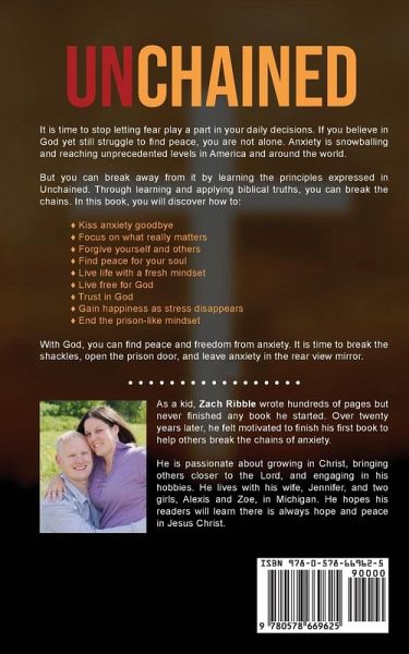 Did you know that only 36.9% of people suffering with anxiety disorders receive treatment, yet it is highly treatable? Here's the problem you run into: in our world, anxiety is skyrocketing every day and many don't know where to turn or won't seek help. This means you may struggle with mental pitfalls that hinder your success in life, stop you from pursuing your dreams, or develop a stronger relationship with God. Fortunately for you, the solution is here now - Unchained: Spiritually Smart Ways to Eliminate Anxiety, Find Peace, and Live Free for God. This new book shows you biblical truths applicable to your life that will stay with you in order to destroy anxiety. You will discover the following:It shows you immediately where to always direct your attention so you can stop suffering, which means you will start healing and finding peace with God. (Page 4) The book teaches you how to naturally release negative thoughts so you can start getting your mind back on track, which allows you to breathe easier. (Page 16) It tells you how to escape the unnecessary burdens chaining you down in life so you can stop falling for lies from the enemy, which means Jesus Christ becomes the cornerstone of your life. (Page 24) The book illustrates a trait Jesus embodied so you can persevere, which helps you trust more in the Lord and conquer any fears or uncertainties in life. (Page 34) The book explains how you can begin transforming your mindset so you align with God's will for your life, which means you will have a renewed sense of purpose. (Page 50) The book tells you how to avoid falling for lies so you can eliminate anxiety, which means you will take back ownership of your mind and conquer fear. (Page 68) It shows you how to channel a calmer mindset so you can be more prepared when challenging situations occur, which means you will extinguish any fires in your life much easier. (Page 78) It teaches you ways to develop such a deep passion for the Lord so you can end the prison-like mindset, which means you can thrive loving on others and spreading the Good News of the Gospel. (Page 89) This proven anxiety-eliminating method is based on Ribble's true story of redemption from hitting rock bottom to thriving based on God's biblical truths. This book will help change your life for the better by eliminating your anxiety, finding peace, and living God's will for your life. Buy it now today!