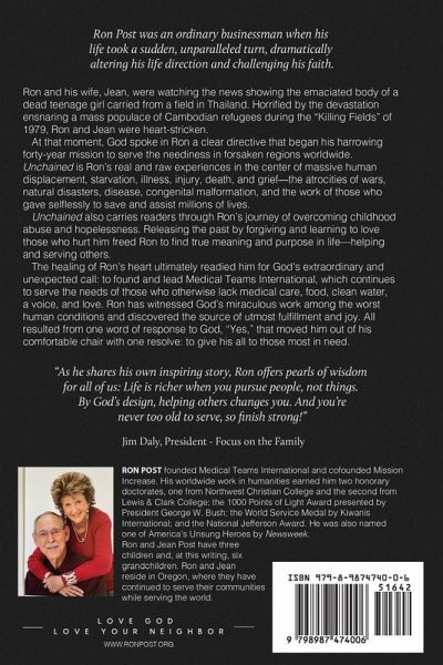 Ron Post was an ordinary businessman when his life took a sudden, unparalleled turn, dramatically altering his life direction and challenging his faith. Ron and his wife, Jean, were watching the news showing the emaciated body of a dead teenage girl carried from a field in Thailand. Horrified by the devastation ensnaring a mass populace of Cambodian refugees during the "Killing Fields" of 1979, Ron and Jean were heart-stricken. At that moment, God spoke in Ron a clear directive that began his harrowing forty-year mission to serve the neediness in forsaken regions worldwide. Unchained is Ron's real and raw experiences in the center of massive human displacement, starvation, illness, injury, death, and grief-the atrocities of wars, natural disasters, disease, congenital malformation, and the work of those who gave selflessly to save and assist millions of lives. Unchained also carries readers through Ron's journey of overcoming childhood abuse and hopelessness. Releasing the past by forgiving and learning to love those who hurt him freed Ron to find true meaning and purpose in life-helping and serving others. The healing of Ron's heart ultimately readied him for God's extraordinary and unexpected call: to found and lead Medical Teams International, which continues to serve the needs of those who otherwise lack medical care, food, clean water, a voice, and love. Ron has witnessed God's miraculous work among the worst human conditions and discovered the source of utmost fulfillment and joy. All resulted from one word of response to God, "Yes," that moved him out of his comfortable chair with one resolve: to give his all to those most in need.