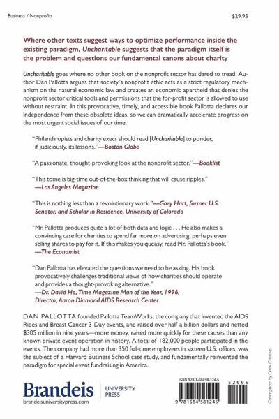 Uncharitable investigates how for-profit strategies could and should be used by nonprofits. Uncharitable goes where no other book on the nonprofit sector has dared to tread. Where other texts suggest ways to optimize performance inside the existing charity paradigm, Uncharitable suggests that the paradigm itself is the problem and calls into question our fundamental canons about charity. Dan Pallotta argues that society's nonprofit ethic creates an inequality that denies the nonprofit sector critical tools and permissions that the for-profit sector is allowed to use without restraint. These double standards place the nonprofit sector at an extreme disadvantage. While the for-profit sector is permitted to use all the tools of capitalism, the nonprofit sector is prohibited from using any of them. Capitalism is blamed for creating inequities in our society, but charity is prohibited from using the tools of capitalism to rectify them-and ironically, this is all done in the name of charity. This irrational system, Pallotta explains, has its roots in four-hundred-year-old Puritan ethics that banished self-interest from the realm of charity. The ideology is policed today by watchdog agencies and the use of so-called efficiency measures, which Pallotta argues are flawed, unjust, and should be abandoned. By declaring our independence from these obsolete ideas, Pallotta theorizes, we can dramatically accelerate progress on the most urgent social issues of our time. Uncharitable is an important, provocative, timely, and accessible book-a manifesto about equal economic rights for charity. This edition has a new, updated introduction by the author.