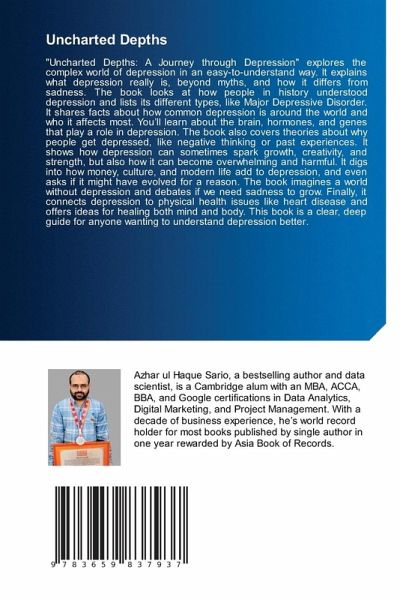 "Uncharted Depths: A Journey through Depression" explores the complex world of depression in an easy-to-understand way. It explains what depression really is, beyond myths, and how it differs from sadness. The book looks at how people in history understood depression and lists its different types, like Major Depressive Disorder. It shares facts about how common depression is around the world and who it affects most. You'll learn about the brain, hormones, and genes that play a role in depression. The book also covers theories about why people get depressed, like negative thinking or past experiences. It shows how depression can sometimes spark growth, creativity, and strength, but also how it can become overwhelming and harmful. It digs into how money, culture, and modern life add to depression, and even asks if it might have evolved for a reason. The book imagines a world without depression and debates if we need sadness to grow. Finally, it connects depression to physical health issues like heart disease and offers ideas for healing both mind and body. This book is a clear, deep guide for anyone wanting to understand depression better.