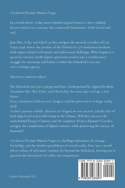 Uncharted Realms: Mission Vegas In a world where reality meets limitless digital frontiers, three unlikely heroes embark on a journey that transcends boundaries-both virtual and real. Join Alex, Echo, and Glitch as they navigate the neon-lit corridors of Las Vegas 2048, where the promise of the Holodeck's 5D simulations beckons with unprecedented adventures and unforeseen challenges. What begins as a quest for survival amidst digital oppression evolves into a revolutionary struggle for autonomy and balance within the Holodeck's vast and ever-evolving tapestry. Discover a universe where:The Holodeck isn't just a playground but a battleground for digital freedom. Anomalies like Alex, Echo, and Glitch defy the status quo to forge a new future. Every simulation holds secrets, dangers, and the potential to reshape reality itself. As their journey unfolds, alliances are forged, secrets unravel, and the fate of both digital and real worlds hangs in the balance. Will they uncover the truth behind Project Chimera and the enigmatic Project Elysium? Can they navigate the complexities of digital existence while preserving the essence of humanity? Uncharted Realms: Mission Vegas is a thrilling exploration of courage, friendship, and the limitless possibilities of virtual reality. Dive into a world where echoes of adventure resonate far beyond the Holodeck, inviting you to question the boundaries of reality and imagination.