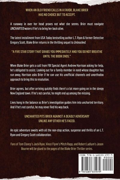When an old friend calls in a favor, Blake Brier has no choice but to accept. A runaway in over her head proves not what she seems. Brier must navigate UNCHARTED waters if he's to bring her back alive. The latest installment from USA Today bestselling author L.T. Ryan & former Detective Gregory Scott, Blake Brier returns in the thrilling sequel to Unleashed. "A FIVE STAR story that grabs you immediately and you do not breathe until the book ends." When Blake Brier gets a call from FBI Special Agent Andrew Harrison asking for help, he's obligated to assist. Looking out for a family member in need whose daughter has run away, Harrison asks Brier if he can use his unofficial channels and unorthodox approach to bring this to resolution. Brier agrees, but after arriving quickly finds there's a lot more going on in the sleepy New England town. If he's not careful, he might end up among the missing. Lives hang in the balance as Brier's investigation guides him into uncharted territory. And if he's not careful, he may never find his way back. Uncharted pits Brier against a deadly adversary unlike any other he's faced. An epic adventure awaits with all the non-stop action, suspense and thrills of an L.T. Ryan and Gregory Scott collaboration. Fans of Tom Clancy's Jack Ryan, Vince Flynn's Mitch Rapp, and Robert Ludlum's Jason Bourne will be glued to the pages of the Blake Brier Thriller series.