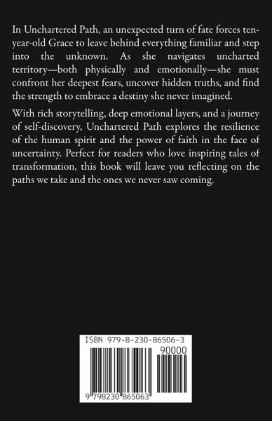 In Unchartered Path, an unexpected turn of fate forces ten-year-old Grace to leave behind everything familiar and step into the unknown. As she navigates uncharted territory-both physically and emotionally-she must confront her deepest fears, uncover hidden truths, and find the strength to embrace a destiny she never imagined. With rich storytelling, deep emotional layers, and a journey of self-discovery, Unchartered Path explores the resilience of the human spirit and the power of faith in the face of uncertainty. Perfect for readers who love inspiring tales of transformation, this book will leave you reflecting on the paths we take and the ones we never saw coming.