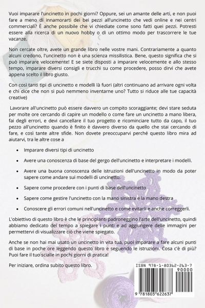 Vuoi imparare l'uncinetto in pochi giorni? Oppure, sei un amante delle arti, e non puoi fare a meno di innamorarti dei bei pezzi all'uncinetto che vedi online e nei centri commerciali? È anche possibile che vi chiediate come sono fatti quei pezzi. Potresti essere alla ricerca di un nuovo hobby o di un ottimo modo per trascorrere le tue vacanze. Non cercate oltre, avete un grande libro nelle vostre mani. Contrariamente a quanto alcuni credono, l'uncinetto non è una scienza missilistica. Bene, questo significa che si può imparare velocemente! E se siete disposti a imparare velocemente e allo stesso tempo, imparare diversi consigli e trucchi su come procedere, posso dirvi che avete appena scelto il libro giusto. Con così tanti tipi di uncinetto e modelli là fuori (altri continuano ad arrivare ogni volta e chi dice che non si può nemmeno inventarne uno? Tutto si riduce alle tue capacità creative) Lavorare all'uncinetto può essere davvero un compito scoraggiante; devi stare seduta per molte ore cercando di capire un modello o come fare un uncinetto a mano libera, fai degli errori, e devi cancellare il tuo progetto e ricominciare tutto da capo, il tuo pezzo all'uncinetto quando è finito è davvero diverso da quello che stai cercando di fare, e così tante altre sfide. Non dovete preoccuparvi perché questo libro mira ad aiutarvi, tra le altre cose a Imparare diversi tipi di uncinetto Avere una conoscenza di base del gergo dell'uncinetto e interpretare i modelli. Avere una buona conoscenza delle istruzioni dell'uncinetto in modo da poter sapere come andare sui modelli di uncinetto. Sapere come procedere con i punti di base dell'uncinetto Sapere come gestire l'uncinetto con la mano sinistra e la mano destra Conoscere gli errori comuni nell'uncinetto e come evitarli e anche correggerli. L'obiettivo di questo libro è che le principianti padroneggino l'arte dell'uncinetto, quindi abbiamo dedicato del tempo a spiegare i punti e ad aggiungere delle immagini per permettervi di visualizzare ciò che viene spiegato. Anche se non hai mai usato un uncinetto in vita tua, puoi imparare a fare alcuni punti di base in poche ore leggendo questo libro e seguendo le istruzioni. Cosa c'è di più? Puoi fare il tuo scialle in pochi giorni di pratica! Per iniziare, ordina subito questo libro.