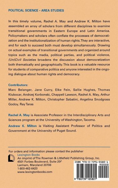 Rachel A. May and Andrew K. Milton have assembled an array of scholars from different disciplines to examine transitional governments in Eastern Europe and Latin America. Drawing on specific political conditions and organized around topics such as the media, political parties, and political violence, (Un)Civil Societies broadens the discussion about democratization both thematically and geographically.