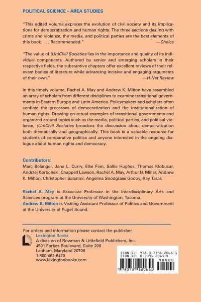 Rachel A. May and Andrew K. Milton have assembled an array of scholars from different disciplines to examine transitional governments in Eastern Europe and Latin America. Drawing on specific political conditions and organized around topics such as the media, political parties, and political violence, (Un)Civil Societies broadens the discussion about democratization both thematically and geographically.