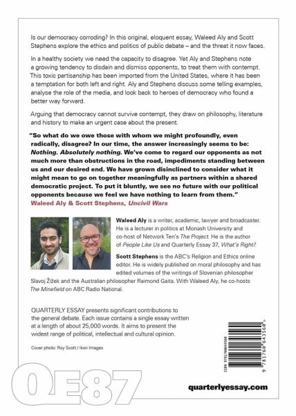 Why is public debate increasingly polarised - and what can we do about it? Is our democracy corroding? In this original, eloquent essay, Waleed Aly and Scott Stephens explore the ethics and politics of public debate - and the threat it now faces. In a healthy society we need the capacity to disagree. Yet Aly and Stephens note a growing tendency to disdain and dismiss opponents, to treat them with contempt. This toxic partisanship has been imported from the United States, where it has been a temptation for both left and right. Aly and Stephens discuss some telling examples, analyse the role of the media, and look back to heroes of democracy who found a better way forward. Arguing that democracy cannot survive contempt, they draw on philosophy, literature and history to make an urgent case about the present. 'So what do we owe those with whom we might profoundly, even radically, disagree? In our time, the answer increasingly seems to be: Nothing. Absolutely nothing. We've come to regard our opponents as not much more than obstructions in the road, impediments standing between us and our desired end. We have grown disinclined to consider what it might mean to go on together meaningfully as partners within a shared democratic project. To put it bluntly, we see no future with our political opponents because we feel we have nothing to learn from them.' Waleed Aly & Scott Stephens, Uncivil Wars