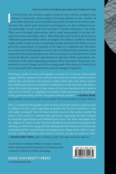 In Uncivil Youth, Soo Ah Kwon explores youth of color activism as linked to the making of democratic citizen-subjects. Focusing attention on the relations of power that inform the social and political practices of youth of color, Kwon examines how after-school and community-based programs are often mobilized to prevent potentially "at-risk" youth from turning to "juvenile delinquency" and crime. These sorts of strategic interventions seek to mold young people to become self-empowered and responsible citizens. Theorizing this mode of youth governance as "affirmative governmentality," Kwon investigates the political conditions that both enable youth of color to achieve meaningful change and limit their ability to do so given the entrenchment of nonprofits in the logic of a neoliberal state. She draws on several years of ethnographic research with an Oakland-based, panethnic youth organization that promotes grassroots activism among its second-generation Asian and Pacific Islander members (ages fourteen to eighteen). While analyzing the contradictions of the youth organizing movement, Kwon documents the genuine contributions to social change made by the young people with whom she worked in an era of increased youth criminalization and anti-immigrant legislation.
