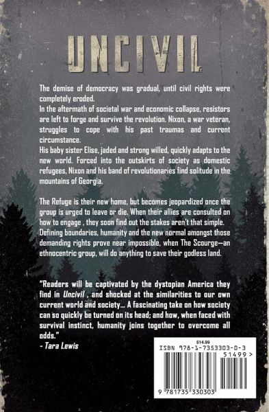 The demise of democracy was gradual, until civil rights were completely eroded. In the aftermath of societal war and economic collapse, resistors are left to forge and survive the revolution. Nixon, a war veteran, struggles to cope with his past traumas and current circumstance. His baby sister Elise, jaded and strong willed, quickly adapts to the new world. Forced into the outskirts of society as domestic refugees, Nixon and his band of revolutionaries find solitude in the mountains of Georgia. The Refuge is their new home, but becomes jeopardized once the group is urged to leave or die. When their allies are consulted on how to engage , they soon find out the stakes aren't that simple. Defining boundaries, humanity and the new normal amongst those demanding rights prove near impossible, when The Scourge-an ethnocentric group, will do anything to save their godless land.