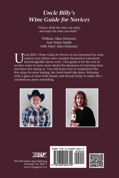 Uncle Billy's Wine Guide for Novices is not intended for wine experts and others that consider themselves extremely knowledgeable about wine. This book is for the rest of us who want to learn more about the pleasures of enjoying wine and talking intelligent about it. About 8% of wine consumers consider themselves extremely knowledge about wine. Of these, about 3% consider themselves wine experts. This leaves the rest of us, about 92% who want to learn more about wine but don't want to become experts. Humor is scattered throughout the book to make your reading more enjoyable. The goal is to help you become more knowledgeable about wine and have fun doing so. And remember: "Always drink the wine you enjoy, and enjoy the wine you drink." William Allan Kritsonis, PhD, Author