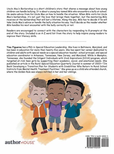 Uncle Mac's Barbershop is a short children's story that shares a message about how young children can handle bullying. It is about a young boy named Milo who encounters a bully at school. He seeks advice from his Uncle Mac on how to handle the situation. When Milo visits his Uncle Mac's barbershop, it's not just the love that brings them together, but the mentoring Milo receives at the barbershop that will last a lifetime. Along the way, Milo has to decide if he will take Uncle Mac's advice or handle the bully situation his way. You'll decide as the reader whether Milo handles his next encounter with the bully correctly or not. Readers are encouraged to connect with the characters by responding to 8 prompts at the end of the story. Included is an A-Z word list from the story to help inspire young readers to improve their literacy skills.