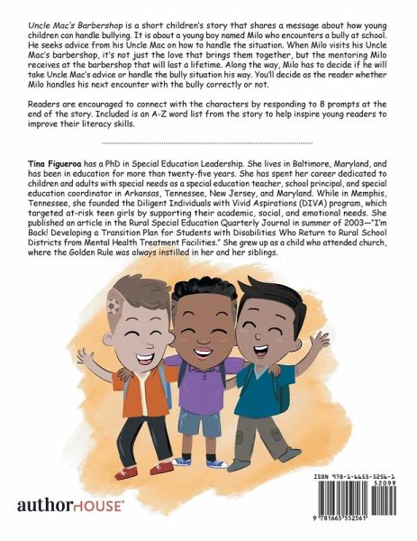 Uncle Mac's Barbershop is a short children's story that shares a message about how young children can handle bullying. It is about a young boy named Milo who encounters a bully at school. He seeks advice from his Uncle Mac on how to handle the situation. When Milo visits his Uncle Mac's barbershop, it's not just the love that brings them together, but the mentoring Milo receives at the barbershop that will last a lifetime. Along the way, Milo has to decide if he will take Uncle Mac's advice or handle the bully situation his way. You'll decide as the reader whether Milo handles his next encounter with the bully correctly or not. Readers are encouraged to connect with the characters by responding to 8 prompts at the end of the story. Included is an A-Z word list from the story to help inspire young readers to improve their literacy skills.