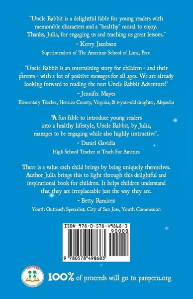 Uncle Rabbit is a collection of stories by author Julia Ardiles de Espinoza. Uncle Rabbit has many fables that are positive, entertaining, and valuable for children, young adults, and families. Julia is an industrial engineer from the National University of San Marcos. Uncle Rabbit will be a blessing to your family given that it brings positive sense of humor in addition to commendable principles for the next generation of leaders.
