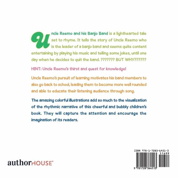 Uncle Reemo and his Banjo Band is a lighthearted tale set to rhyme. It tells the story of Uncle Reemo who is the leader of a banjo band and seems quite content entertaining by playing his music and telling some jokes, until one day when he decides to quit the band. ??????? BUT WHY?????? HINT: Uncle Reemo's thirst and quest for knowledge! Uncle Reemo's pursuit of learning motivates his band members to also go back to school, leading them to become more well rounded and able to educate their listening audience through song. The amazing colorful illustrations add so much to the visualization of the rhythmic narrative of this cheerful and bubbly children's book. They will capture the attention and encourage the imagination of its readers.