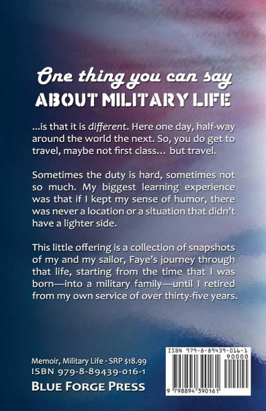 One thing you can say about military life is that it is different. Here one day, half-way around the world the next. So, you do get to travel, maybe not first class... but travel. Sometimes the duty is hard, sometimes not so much. My biggest learning experience was that if I kept my sense of humor, there was never a location or a situation that didn't have a lighter side. This little offering is a collection of snapshots of my and my sailor, Faye's journey through that life, starting from the time that I was born-into a military family-until I retired from my own service of over thirty-five years.