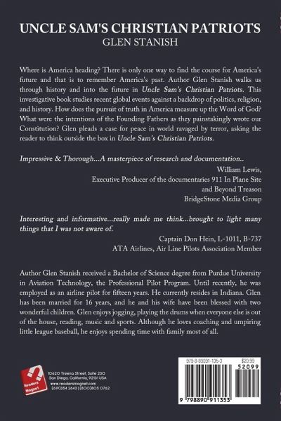Where is America heading? There is only one way to find the course for America's future and that is to remember America's past. Author Glen Stanish walks us through history and into the future in Uncle Sam's Christian Patriots. This investigative book studies recent global events against a backdrop of politics, religion, and history. How does the pursuit of truth in America measure up the Word of God? What were the intentions of the Founding Fathers as they painstakingly wrote our Constitution? Glen pleads a case for peace in world ravaged by terror, asking the reader to think outside the box in Uncle Sam's Christian Patriots.