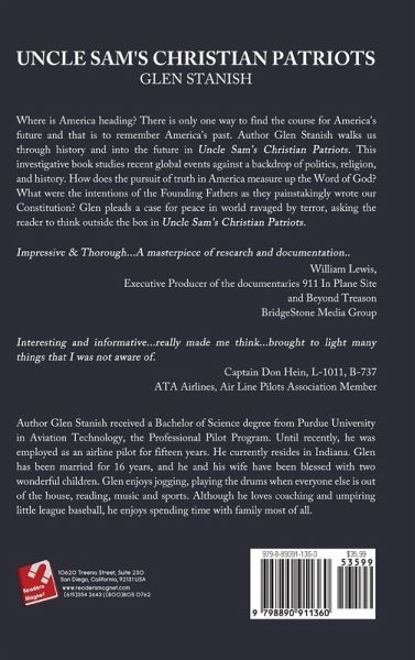 Where is America heading? There is only one way to find the course for America's future and that is to remember America's past. Author Glen Stanish walks us through history and into the future in Uncle Sam's Christian Patriots. This investigative book studies recent global events against a backdrop of politics, religion, and history. How does the pursuit of truth in America measure up the Word of God? What were the intentions of the Founding Fathers as they painstakingly wrote our Constitution? Glen pleads a case for peace in world ravaged by terror, asking the reader to think outside the box in Uncle Sam's Christian Patriots.