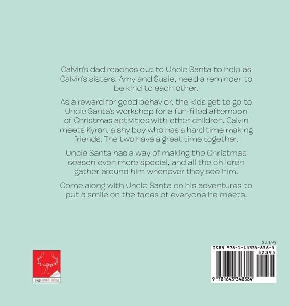 Calvin's dad reaches out to Uncle Santa to help as Calvin's sisters, Amy and Susie, need a reminder to be kind to each other. As a reward for good behavior, the kids get to go to Uncle Santa's workshop for a fun-filled afternoon of Christmas activities with other children. Calvin meets Kyran, a shy boy who has a hard time making friends. The two have a great time together. Uncle Santa has a way of making the Christmas season even more special, and all the children gather around him whenever they see him. Come along with Uncle Santa on his adventures to put a smile on the faces of everyone he meets.