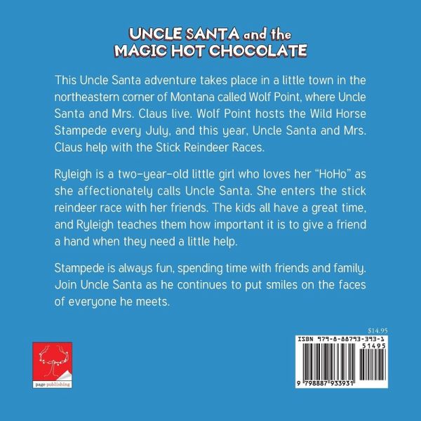 This Uncle Santa adventure takes place in a little town in the northeastern corner of Montana called Wolf Point, where Uncle Santa and Mrs. Claus live. Wolf Point hosts the Wild Horse Stampede every July, and this year, Uncle Santa and Mrs. Claus help with the Stick Reindeer Races. Ryleigh is a two-year-old little girl who loves her "HoHo" as she affectionately calls Uncle Santa. She enters the stick reindeer race with her friends. The kids all have a great time, and Ryleigh teaches them how important it is to give a friend a hand when they need a little help. Stampede is always fun, spending time with friends and family. Join Uncle Santa as he continues to put smiles on the faces of everyone he meets.