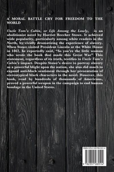 A MORAL BATTLE CRY FOR FREEDOM TO THE WORLD Uncle Tom's Cabin, or Life Among the Lowly, is an abolitionist novel by Harriet Beecher Stowe. It achieved wide popularity, particularly among white readers in the North, by vividly dramatizing the experience of slavery. When Stowe visited President Lincoln at the White House in 1862, he reportedly said, "So you're the little woman who wrote the book that made this Great War" This statement, regardless of its truth, testifies to Uncle Tom's Cabin's impact. Despite Stowe's desire to portray slavery as a powerful blight upon the nation, she also did much to expand anti-black sentiment through her presentation of stereotypical black characters in the novel. However, this book, read by hundreds of thousands of Americans, proved a powerful weapon in the campaign to end human bondage in the United States.
