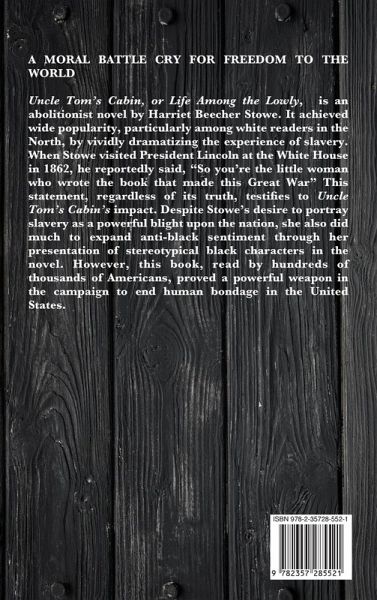 A MORAL BATTLE CRY FOR FREEDOM TO THE WORLDUncle Tom's Cabin, or Life Among the Lowly, is an abolitionist novel by Harriet Beecher Stowe. It achieved wide popularity, particularly among white readers in the North, by vividly dramatizing the experience of slavery. When Stowe visited President Lincoln at the White House in 1862, he reportedly said, "So you're the little woman who wrote the book that made this Great War" This statement, regardless of its truth, testifies to Uncle Tom's Cabin's impact. Despite Stowe's desire to portray slavery as a powerful blight upon the nation, she also did much to expand anti-black sentiment through her presentation of stereotypical black characters in the novel. However, this book, read by hundreds of thousands of Americans, proved a powerful weapon in the campaign to end human bondage in the United States.