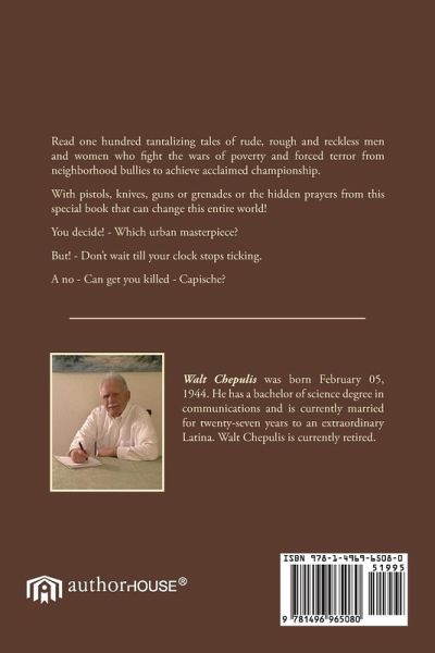 Read one hundred tantalizing tales of rude, rough and reckless men and women who fight the wars of poverty and forced terror from neighborhood bullies to achieve acclaimed championship. With pistols, knives, guns or grenades or the hidden prayers from this special book that can change this entire world! You decide! - Which urban masterpiece? But! - Don't wait till your clock stops ticking. A no - Can get you killed - Capische?