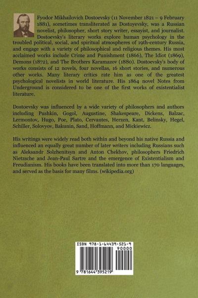 Fyodor Mikhailovich Dostoevsky (11 November 1821 - 9 February 1881), sometimes transliterated as Dostoyevsky, was a Russian novelist, philosopher, short story writer, essayist, and journalist. Dostoevsky's literary works explore human psychology in the troubled political, social, and spiritual atmospheres of 19th-century Russia, and engage with a variety of philosophical and religious themes. His most acclaimed works include Crime and Punishment (1866), The Idiot (1869), Demons (1872), and The Brothers Karamazov (1880). Dostoevsky's body of works consists of 12 novels, four novellas, 16 short stories, and numerous other works. Many literary critics rate him as one of the greatest psychological novelists in world literature. His 1864 novel Notes from Underground is considered to be one of the first works of existentialist literature. Dostoevsky was influenced by a wide variety of philosophers and authors including Pushkin, Gogol, Augustine, Shakespeare, Dickens, Balzac, Lermontov, Hugo, Poe, Plato, Cervantes, Herzen, Kant, Belinsky, Hegel, Schiller, Solovyov, Bakunin, Sand, Hoffmann, and Mickiewicz. His writings were widely read both within and beyond his native Russia and influenced an equally great number of later writers including Russians such as Aleksandr Solzhenitsyn and Anton Chekhov, philosophers Friedrich Nietzsche and Jean-Paul Sartre and the emergence of Existentialism and Freudianism. His books have been translated into more than 170 languages, and served as the basis for many films. (wikipedia.org)